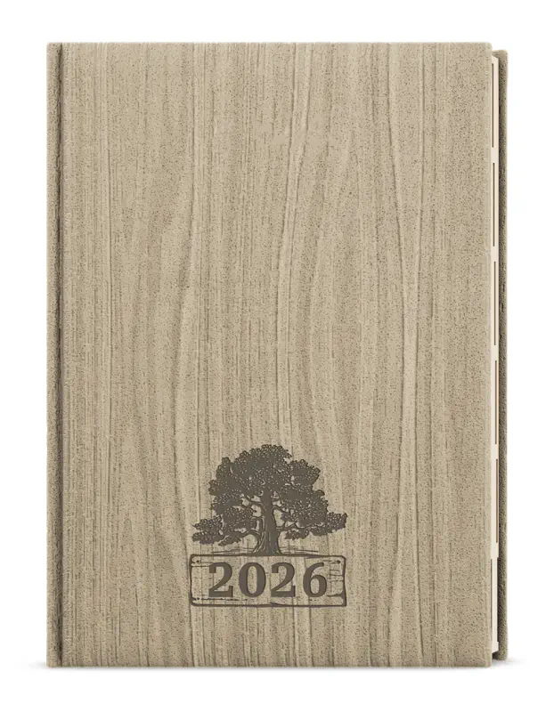 Originální denní diář s přírodním motivem dřeva a ražbou je vyráběný z jemně strukturovaného materiálu s efektním výsekem uvnitř. Má velký prostor pro poznámky a plánování. Výjimečností tohoto diáře je, že soboty i neděle jsou na každé stránce zvlášť.